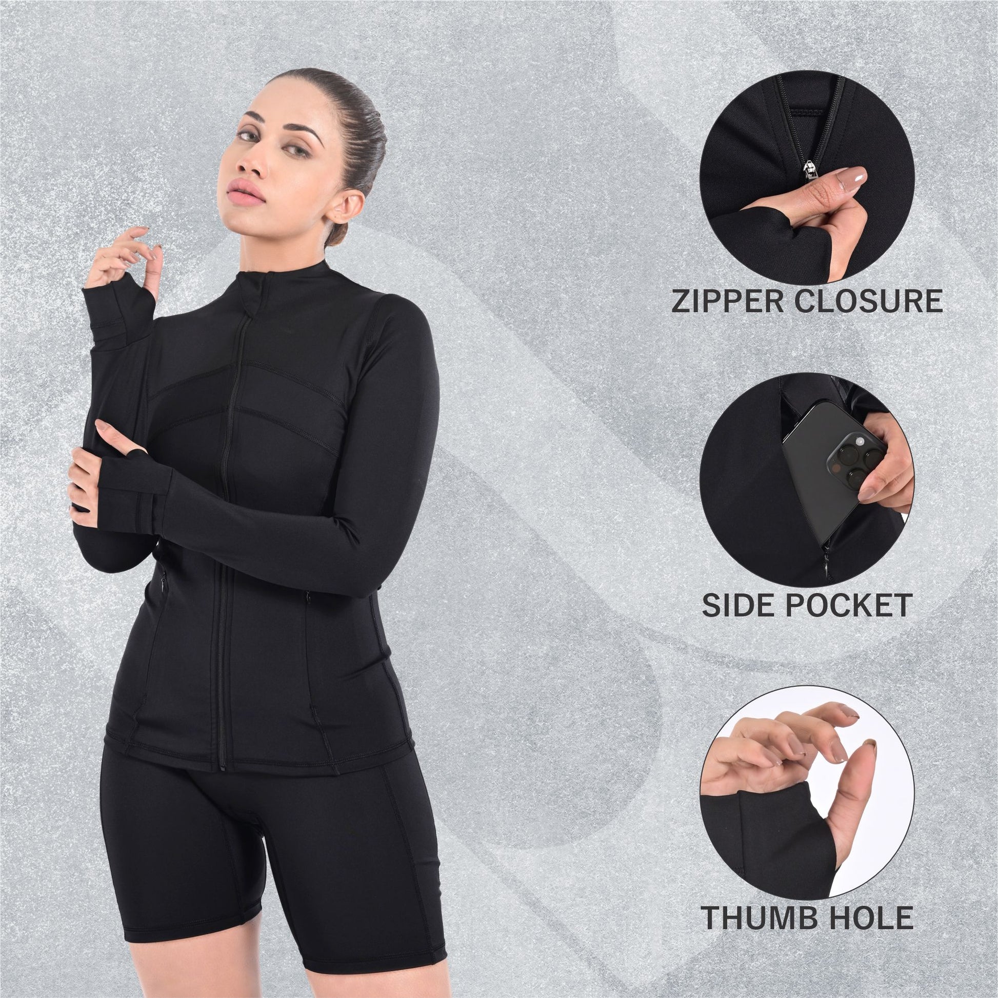 Women’s Workout Zip-Up Jacket – Lightweight Athletic Jacket with Zipper Pockets, Thumb Holes & Moisture-Wicking Fabric