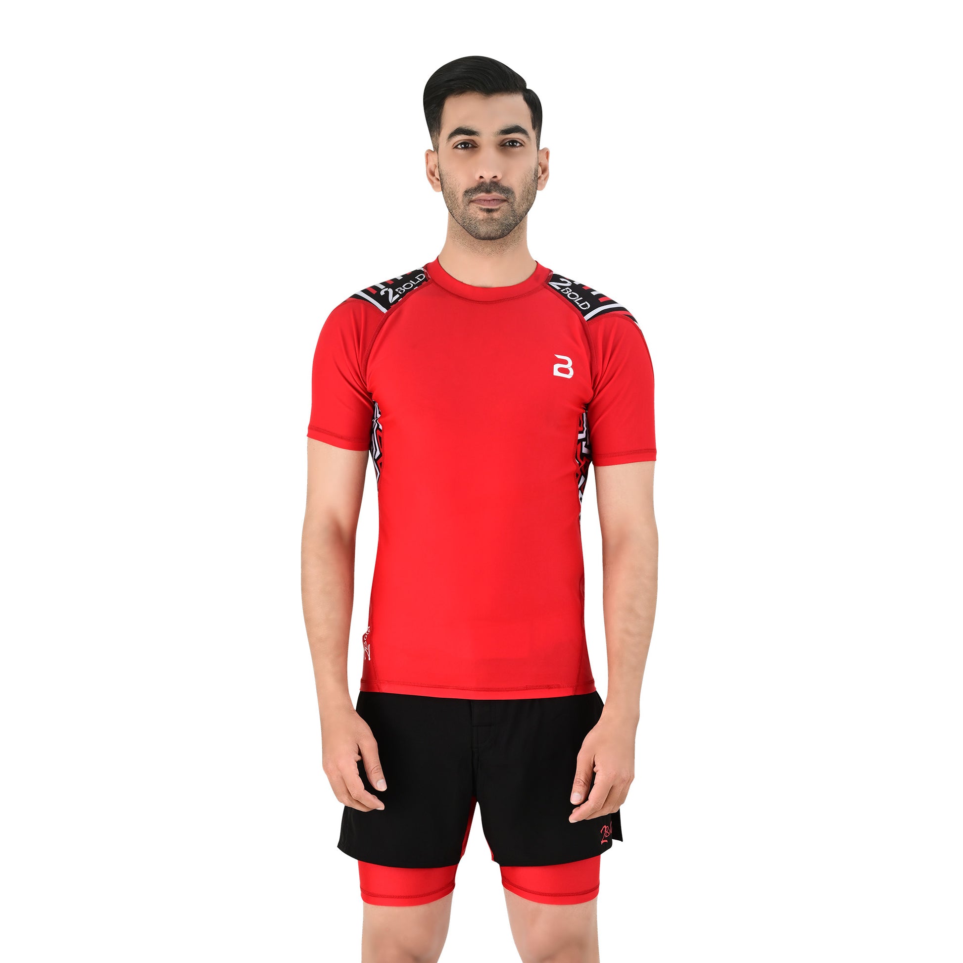 2Bold Men’s Red BJJ Rash Guard and MMA Shorts Set – Jiujitsu, Grappling, Kickboxing Training Gear