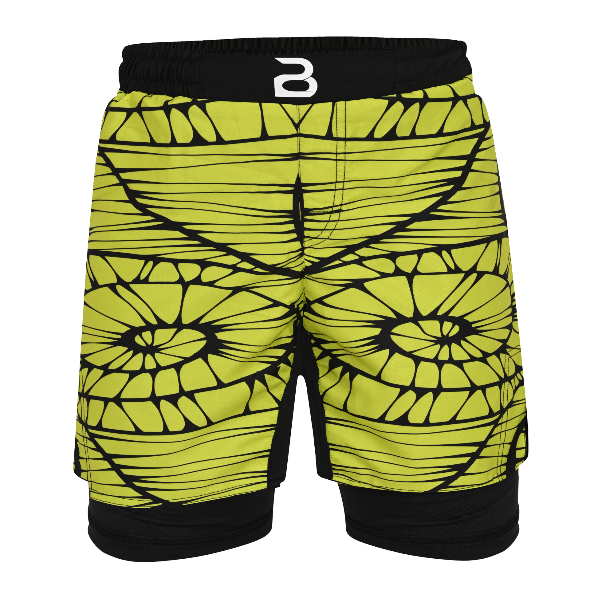 Give your young athlete the power to perform with confidence in the 2BOLD Kids Yellow-Spiral 2-in-1 Hybrid Shorts. Designed for high-energy sports and everyday movement, these shorts deliver unbeatable comfort, flexibility, and durability for MMA, BJJ, wrestling, gym training, football, or outdoor play.